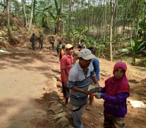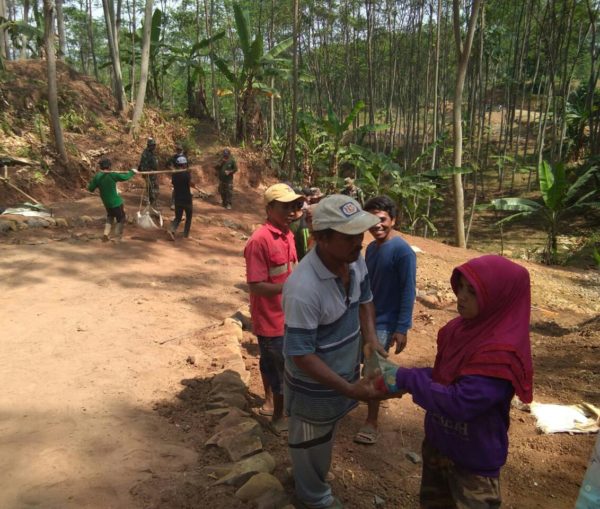 Lokasi kali ini sangatlah terjal dan sulit karena berada di pemukiman pedesaan membuat satgas Pra TMMD dan warga harus bekerja keras mengangkat material.