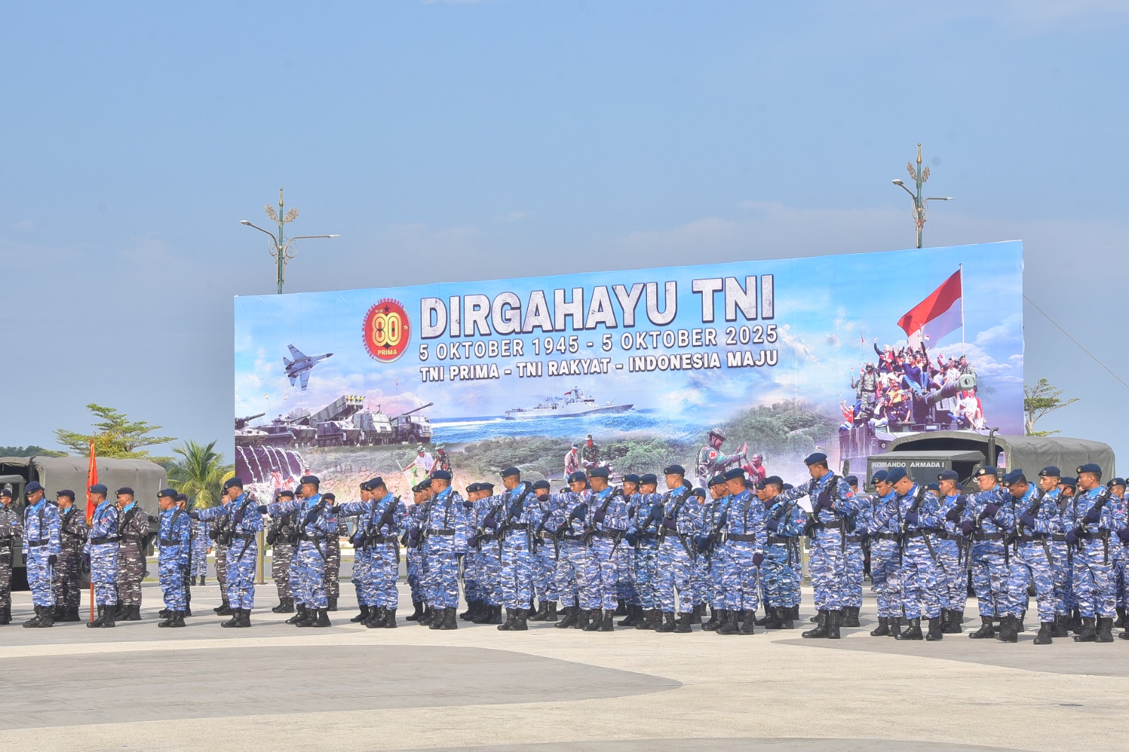 Tanjungpinang — Komandan Pangkalan TNI Angkatan Udara Raja Haji Fisabilillah (Lanud RHF) Kolonel Pnb Rony Widodo, S.T., M.M., M.Han., didampingi Ketua PIA Ardhya Garini Cabang 13/D.I Lanud RHF, Ny. Rina Rony Widodo menghadiri upacara peringatan Hari Ulang Tahun ke-80 Tentara Nasional Indonesia (TNI) yang digelar di Lapangan Tugu Sirih, Tepi Laut Tanjungpinang, Provinsi Kepulauan Riau. Minggu (5/10/2025).