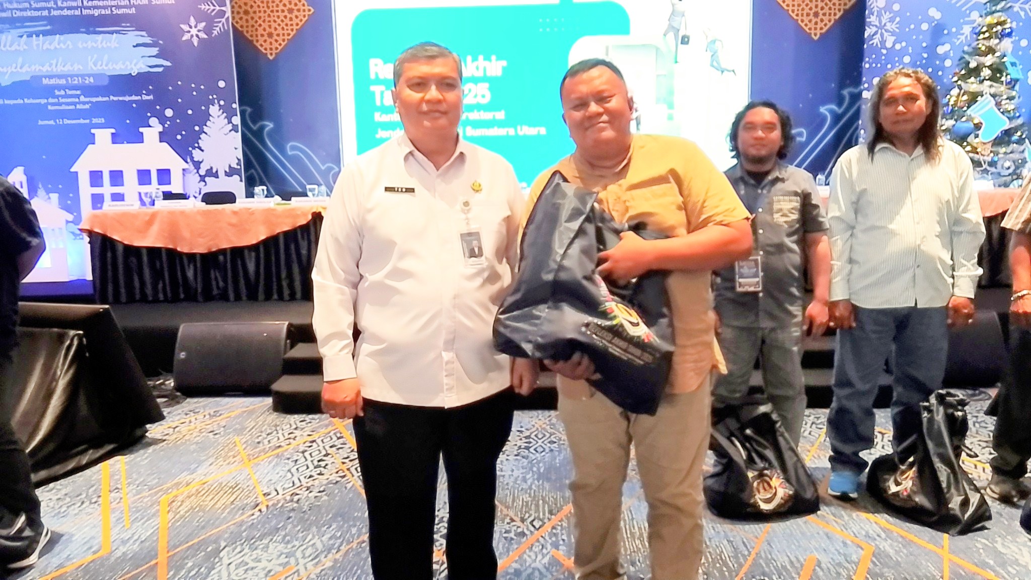 Secara simbolis, Kakanwil Ditjen Imigrasi Sumut beserta jajajaran Kakanim Imigrasi menyerahkan bingkisan sembako kepada perwakilan jurnalis yang hadir.