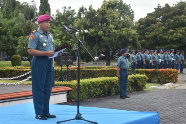 PB|Surabaya – Wakil Komandan Pangkalan Utama TNI AL (Wadan Lantamal) Kolonel Marinir CTO. Sinaga memimpin jalannya upacara penaikan bendera di lapangan upacara Yos Sudarso, Markas Komando Lantamal V Surabaya Jl. Laksda M. Nasir no 56 Tanjung Perak Surabaya, Senin (23/4/2018).