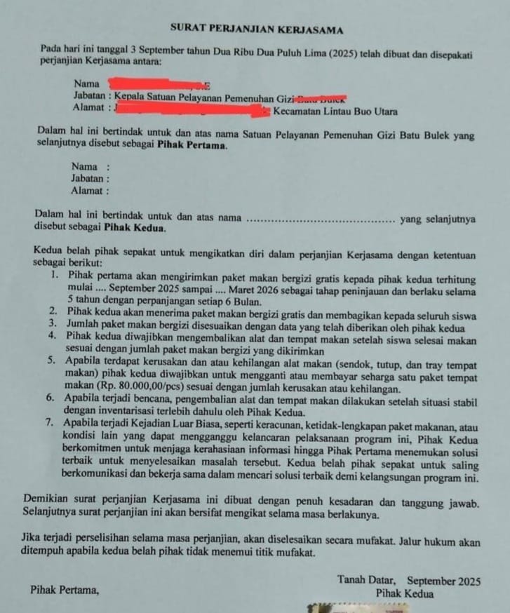 Dalam foto yang beredar, terdapat sembilan poin dari surat perjanjian kerja sama antara SPPG dengan pihak penerima manfaat, yang juga dibubuhi meterai dan stempel instansi pendidikan.