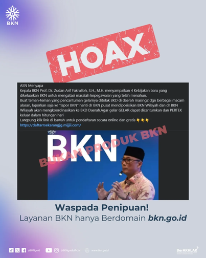 “Seluruh layanan BKN tidak dipungut biaya di luar ketentuan resmi dan tidak pernah meminta pembayaran melalui jalur pribadi. Pastikan ASN dan masyarakat hanya mengakses layanan melalui domain bkn.go.id untuk informasi layanan BKN yang akurat sehingga dapat terhindar dari risiko penipuan,” pesan Wisudo.