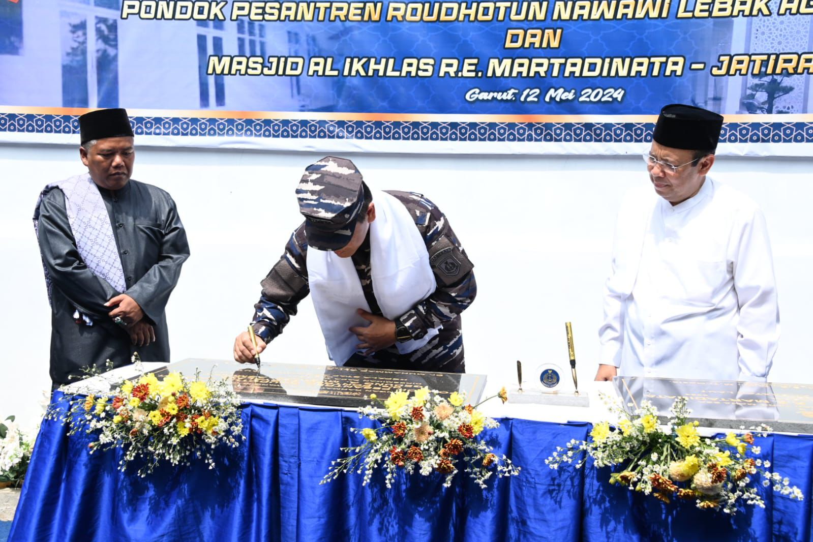 Pada kesempatan tersebut, Kasal beserta rombongan disambut pembina Ponpes Roudhotun Nawawi Prof. Dr. KH Ahmad Tjahja Nugraha dan Pimpinan Ponpes KH Aceng Ali Maki beserta para santri menuju ke dalam Ponpes Roudhotun Nawawi untuk meresmikan Gedung A Mustafa Asmirah dan Masjid Al-Ikhlas R.E. Martadinata Jatirangga yang ditandai dengan penandatanganan prasasti serta peletakan batu pertama.