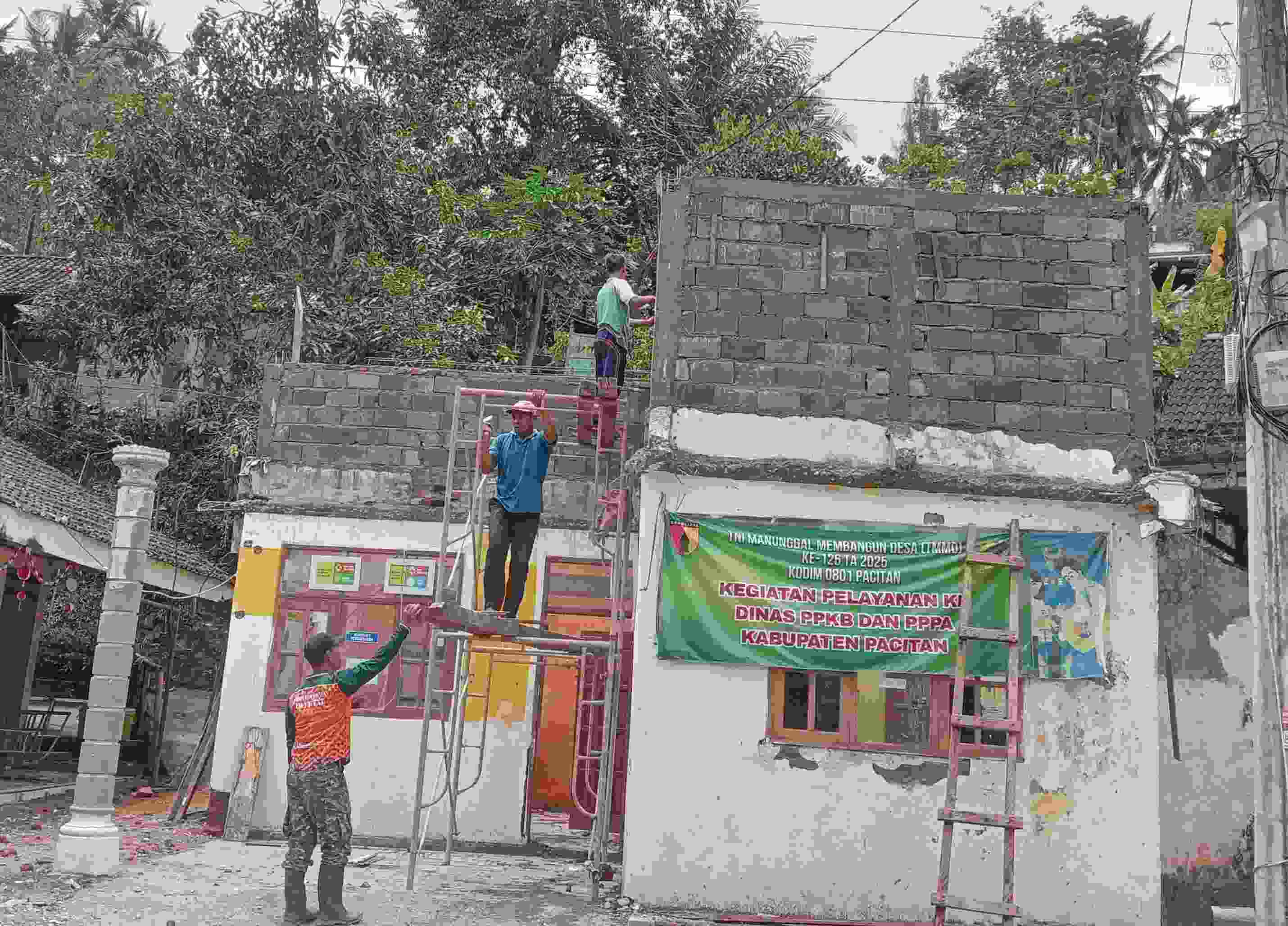 Pacitan, – Program TNI Manunggal Membangun Desa (TMMD) ke-126 Kodim 0801/Pacitan terus berlanjut. Salah satu sasaran fisik yang kini mulai dikerjakan adalah rehabilitasi bangunan Polindes dengan melanjutkan pemasangan batu bata ringan (hebel) bertempat Dusun Krajan, di Desa Petungsinarang, Kecamatan Bandar, Kabupaten Pacitan, Jumat (24/10/2025).