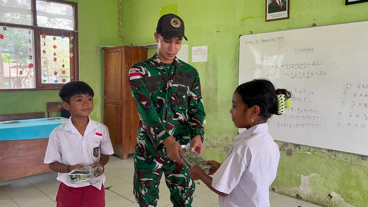 Sebagai bentuk dukungan terhadap peningkatan literasi, personel Satgas juga membagikan buku bacaan kepada para siswa. Pembagian buku tersebut disambut gembira oleh anak-anak yang tampak bersemangat menerima tambahan bahan bacaan untuk menunjang kegiatan belajar mereka di sekolah.