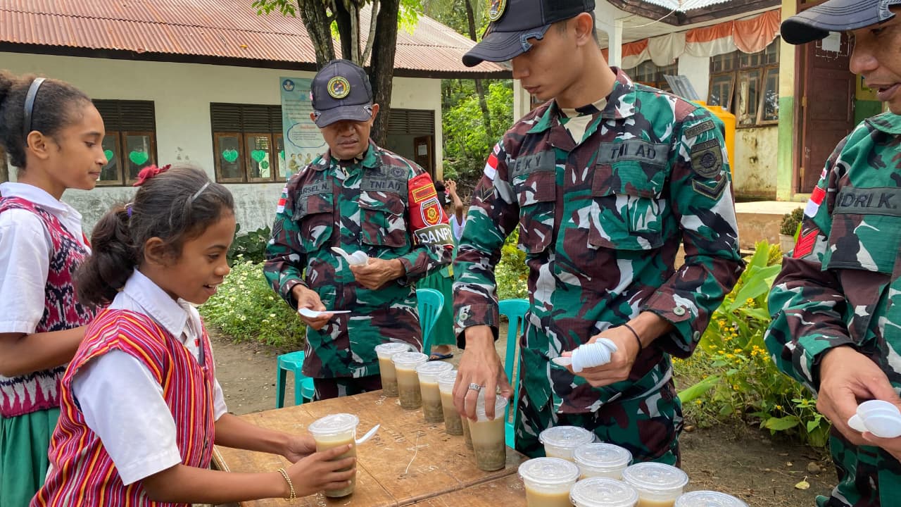 Belu – Satgas Pamtas RI–RDTL Sektor Timur Yonarmed 12 Kostrad melalui Pos Maubusa melaksanakan kegiatan pembagian bubur kacang hijau kepada siswa-siswi SD Beitaus yang berlokasi di Asumanu, Kecamatan Raihat, Kabupaten Belu, Nusa Tenggara Timur, Senin (2/2/2026). Kegiatan ini merupakan bentuk kepedulian TNI terhadap pemenuhan gizi anak-anak sekolah di wilayah perbatasan RI–RDTL.