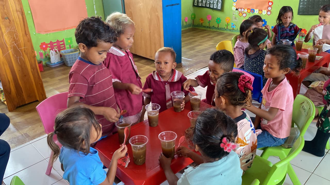 Selain kegiatan belajar, personel Satgas juga membagikan bubur kacang hijau sebagai tambahan gizi bagi anak-anak. Pemberian makanan bergizi ini diharapkan dapat membantu mendukung pertumbuhan serta menjaga kesehatan anak-anak di lingkungan sekolah.