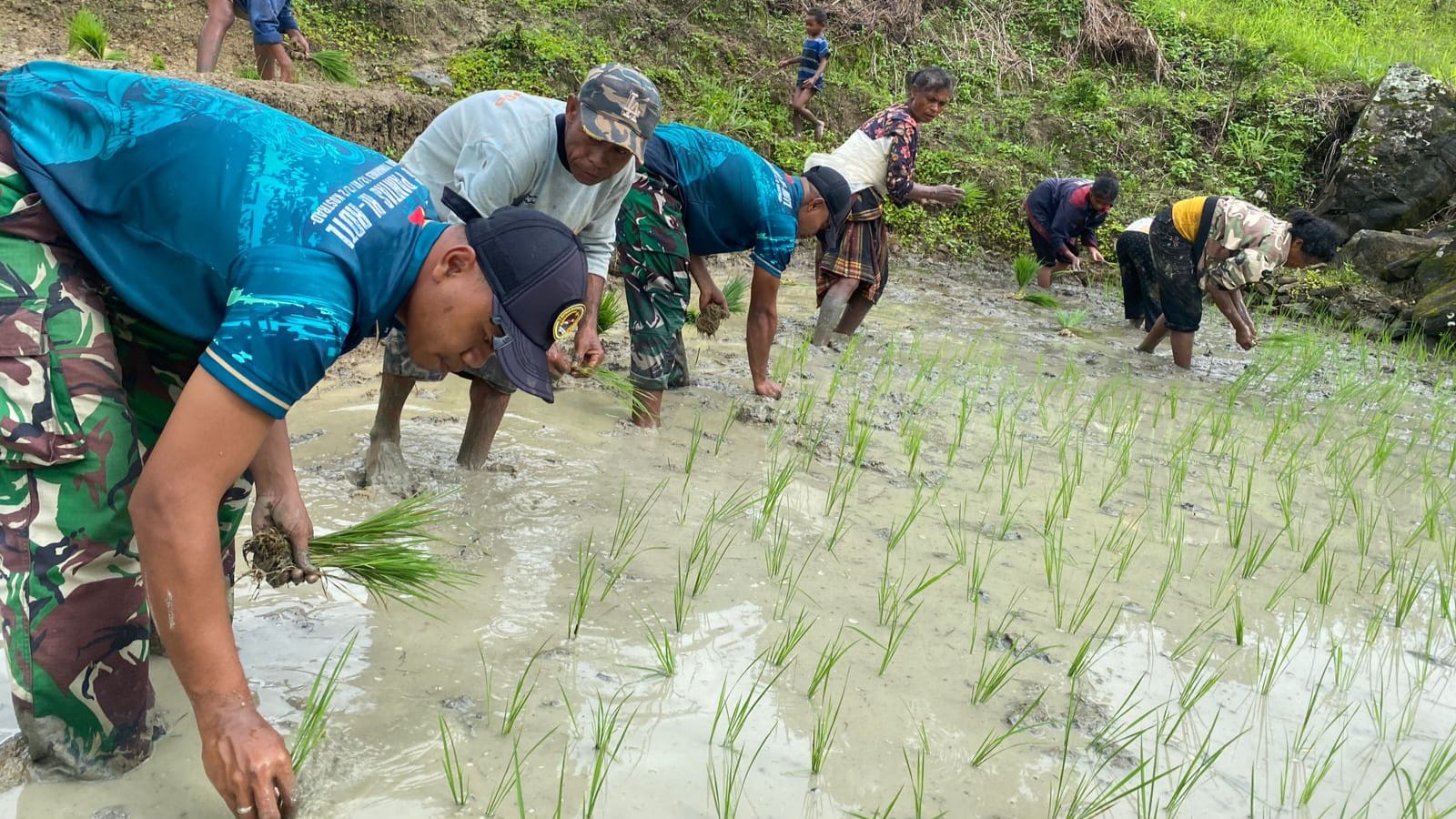 Kehadiran personel Pos Laktutus disambut antusias warga yang bersama-sama turun ke sawah untuk mempercepat proses tanam. Semangat kebersamaan terlihat jelas, mencerminkan kemanunggalan TNI dengan rakyat dalam mendukung sektor pertanian lokal.