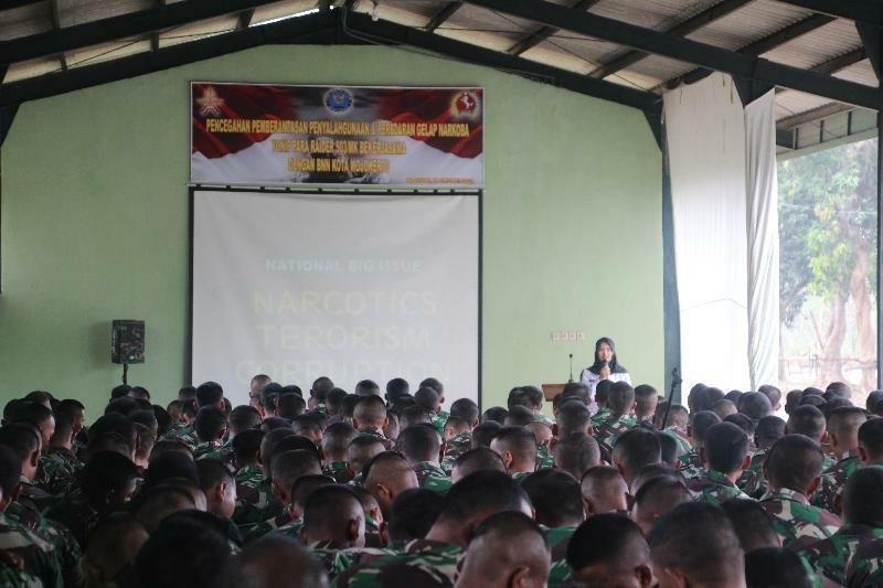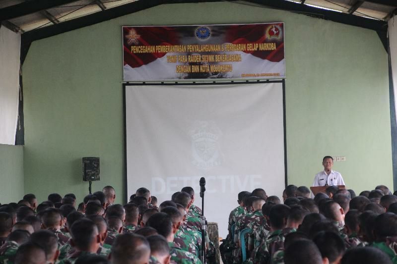 Mojokerto – Yonif Para Raider 503 Kostrad bekerjasama dengan BNN Kota Mojokerto menggelar sosialisasi tentang Pencegahan Pemberantasan Penyalahgunaan dan Peredaran Gelap Narkoba (P4GN) kepada prajurit di Yonif Para Raider 503 Kostrad, Mojokerto, Selasa (30/10).